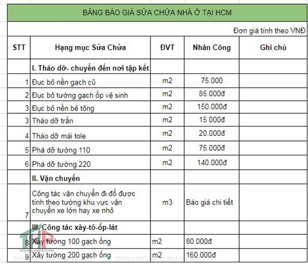 Bảng giá cải tạo sửa chữa tại T.p Hồ Chí Minh