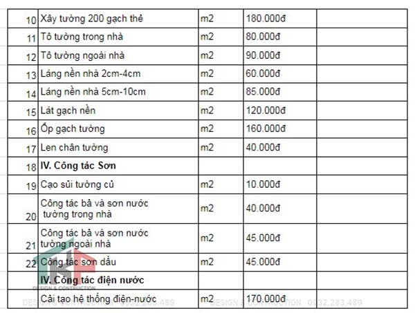 3. Bảng giá tham khảo cải tạo, sửa chữa hiện nay