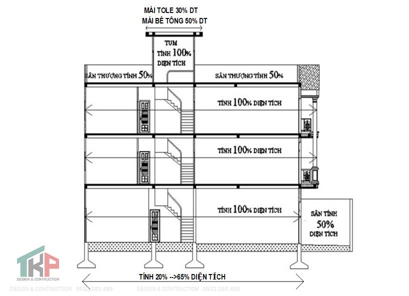 - Phần thông tầng (chưa trang trí) tính 70% diện tích, phần thông tầng có trang trí (tính 100% diện tích)