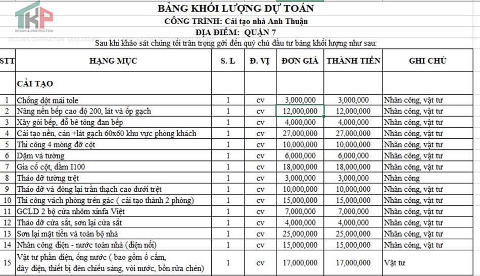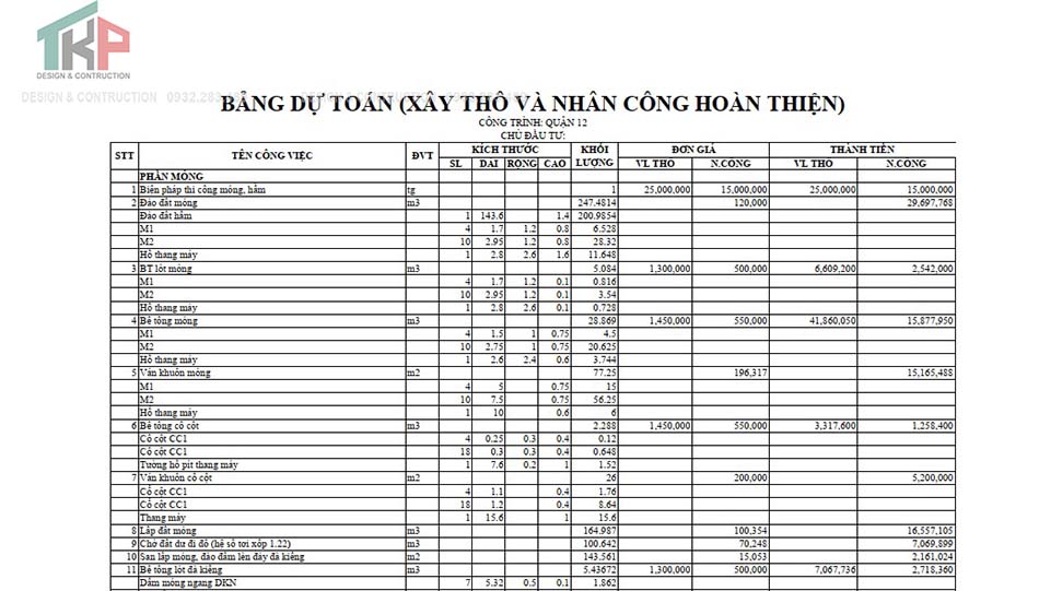 Xây dựng Tấn Khánh Phát gởi bạn tham khảo bảng giá dịch vụ tính dự toán chi tiết công trình nhà ở. Bảng dự toán này có thể giúp bạn tính dự toán chi phí xây dựng ngôi nhà hay để đàm phán chi phí khi chọn nhà thầu thi công xây dựng tránh phát sinh không cần thiết trong quá trình quản lý chi phí ngôi nhà của bạn.